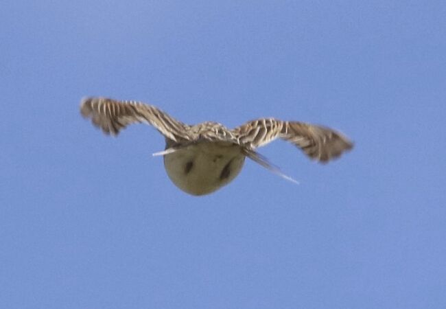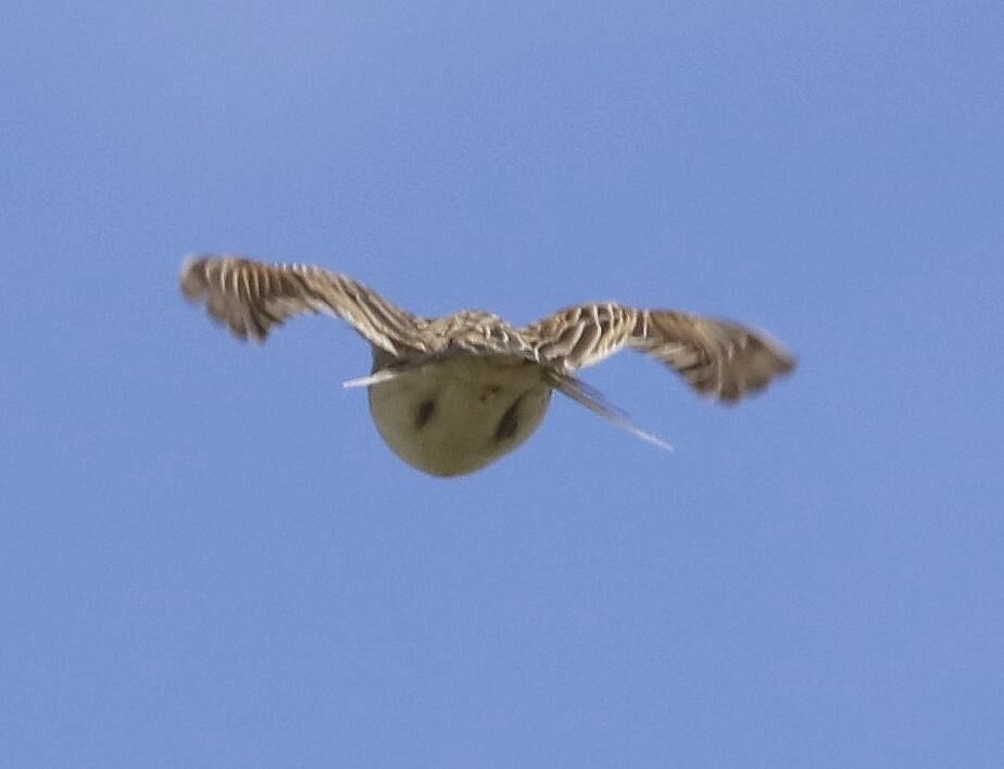 Der Vogelgesang wird von den Männchen überwiegend im Singflug vorgetragen; seltener und dann kürzer vom Boden aus. Er ist lang und über 3 bis 15 Minuten anhaltend und besteht aus einer schnellen, ununterbrochenen Folge von abwechselnd und zum Teil rhythmisch wiederholten rollenden, trillernden oder zirpenden Tönen, in die gelegentlich Imitationen (z. B. von Turmfalken) eingeflochten werden. Mit solchen Singflügen, die für Brüter in offenem Gelände charakteristisch sind und der Markierung des Reviers dienen, ersetzt das Männchen die in dieser Landschaft fehlenden Singwarten. Die Männchen singen ab Ende Januar bis Mitte oder Ende Juli von der Morgendämmerung bis zum Abend. Weibchen singen ebenfalls, jedoch leiser als die Männchen und am Boden sitzend.
