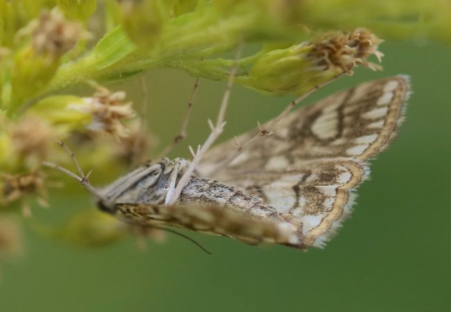 Die Hinterflügel sind in der Grundfarbe ebenfalls weiß. Die Zeichnung ist hier konstanter und deutlicher. Sie besteht aus einer kräftigen inneren Querlinie und einer kräftigen, innen stark zurückspringenden und nach außen weiß gesäumten äußeren Querlinie. Das Mittelfeld ist fast rein weiß und weist nur zwei kräftige Diskalflecke auf. Die submarginale Linie ist meist als breite braune, nach außen gerichtete Zackenbinde entwickelt. Deutlich dunkel gezeichnet ist meist die Saumlinie. Die Fransen sind heller als die Saumlinie, oft auch unregelmäßig gescheckt. Die Falter haben einen gut entwickelten Saugrüssel.